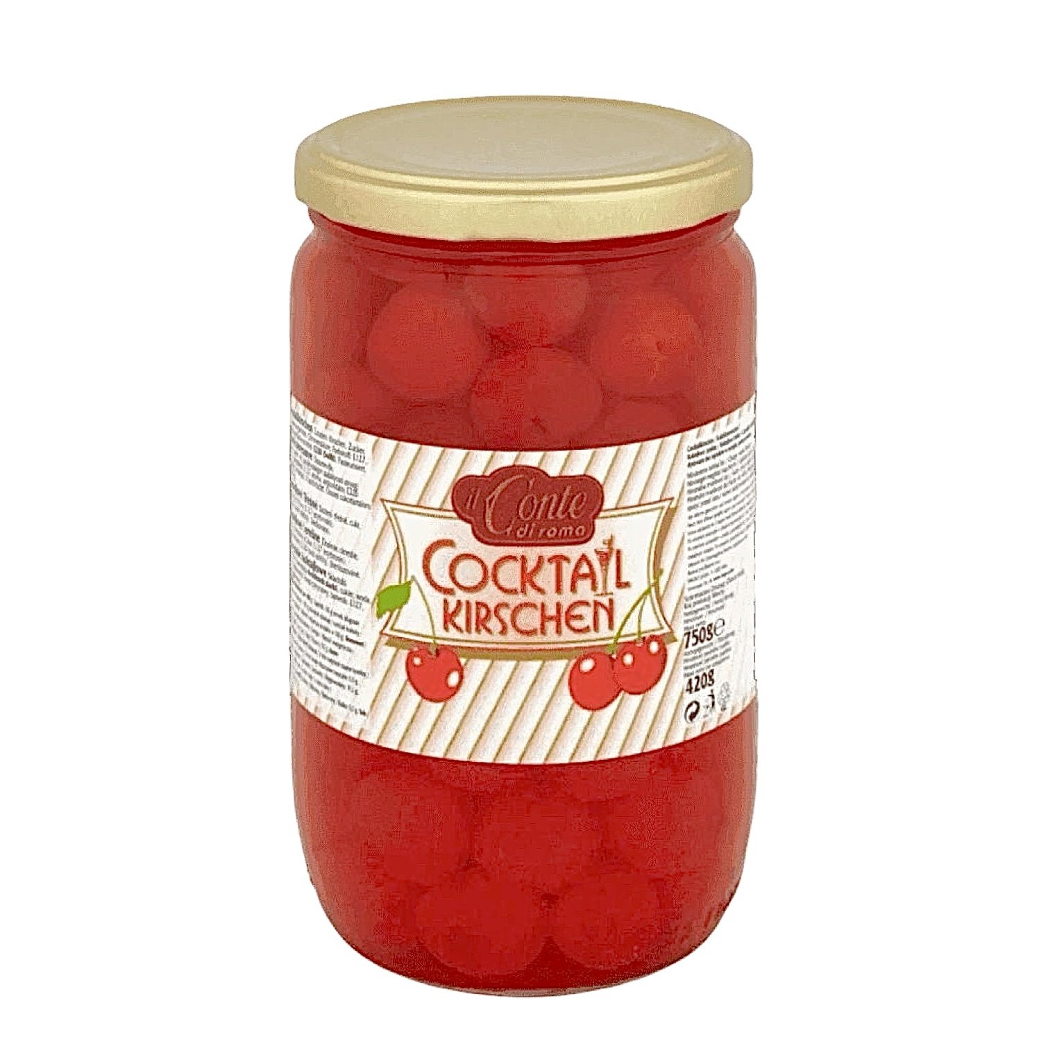 Čerešne koktejlové červené bez stopky 750?g, sterilizované jednodruhové ovocie – kompót. Je vhodný na použitie v koktailoch, dezertoch alebo ako ozdoba.