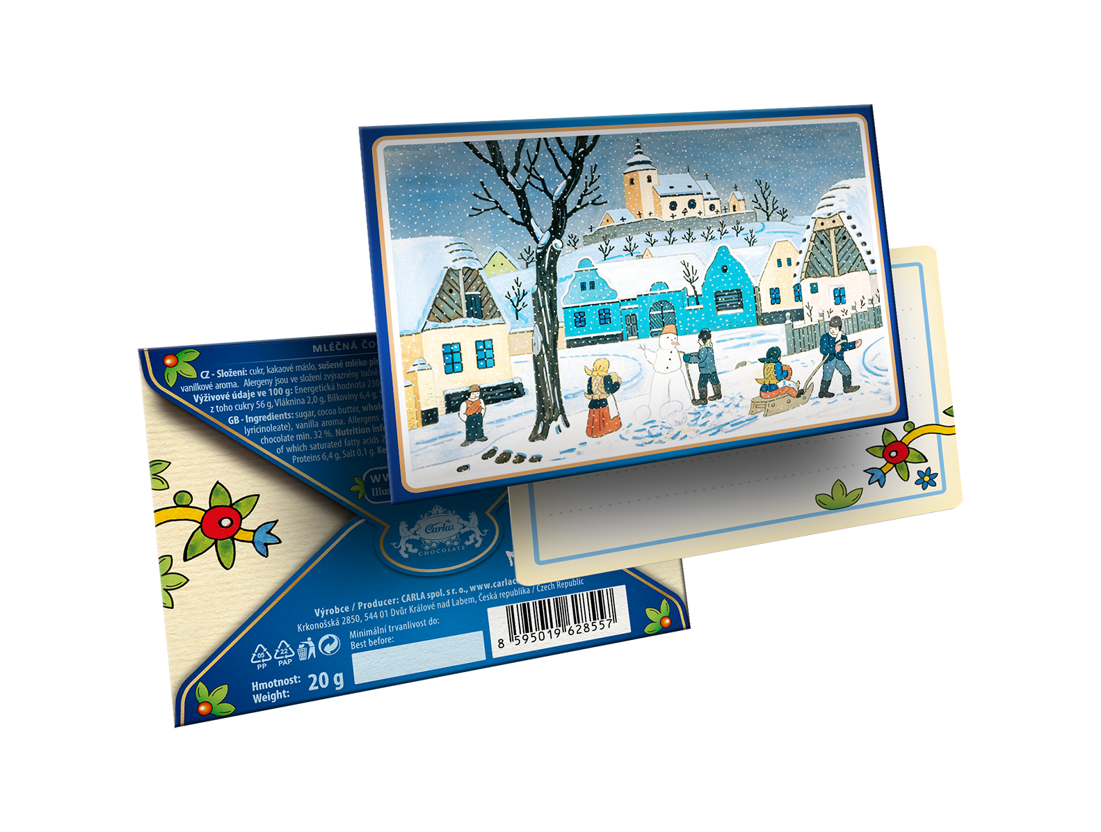 Cukor, kakaové maslo, sušené plnotučné mlieko, kakaová hmota, emulgátory (sójový lecitín, polyglycerol-polyricin-oleát), vanilková aróma. Alergény sú vyznačené tučným písmom.