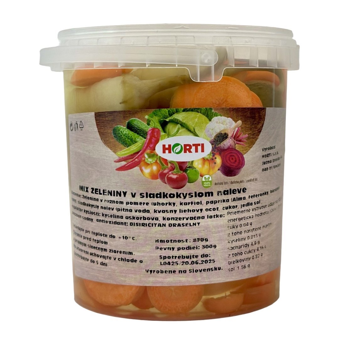 Zelenina v rôznom pomere (mrkva, karfiol, nakladaná zelenina – alma paprika, baranie rohy, uhorka, feferóny, nálev (pitná voda, ocot, cukor, jedlá soľ, konzervačná látky: benzoan sodný, chlorid vápenatý, antioxidanty: disiričitan draselný, kyselina citrónová, kyselina askorbová)), sladkokyslý nálev (pitná voda, kvasný liehový ocot, cukor, jedlá soľ, konzervačná látka: benzoan sodný, , regulátor kyslosti: kyselina askorbová, antioxidant: disiričitan draselný).