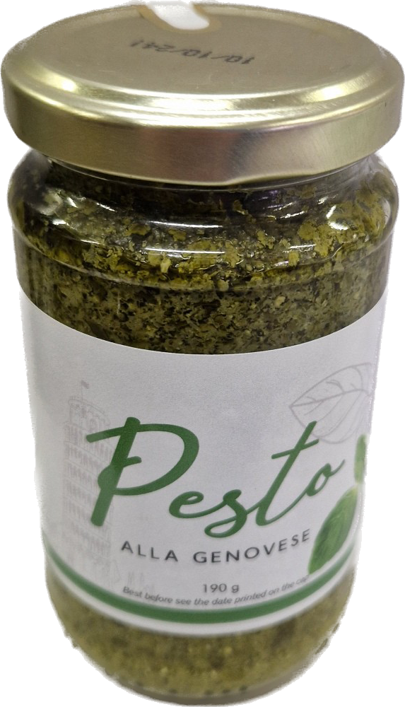 Bazalka 38%, slnečnicový olej, kešu orechy, extra panenský olivový olej, syr Grana Padano (surové kravské mlieko, jedlá soľ, mliekarenské kultúry, syridlo, konzervant, lyzozým = bielkovina z vajec), cesnak, jedlá soľ, regulátor kyslosti: kyselina mliečna .