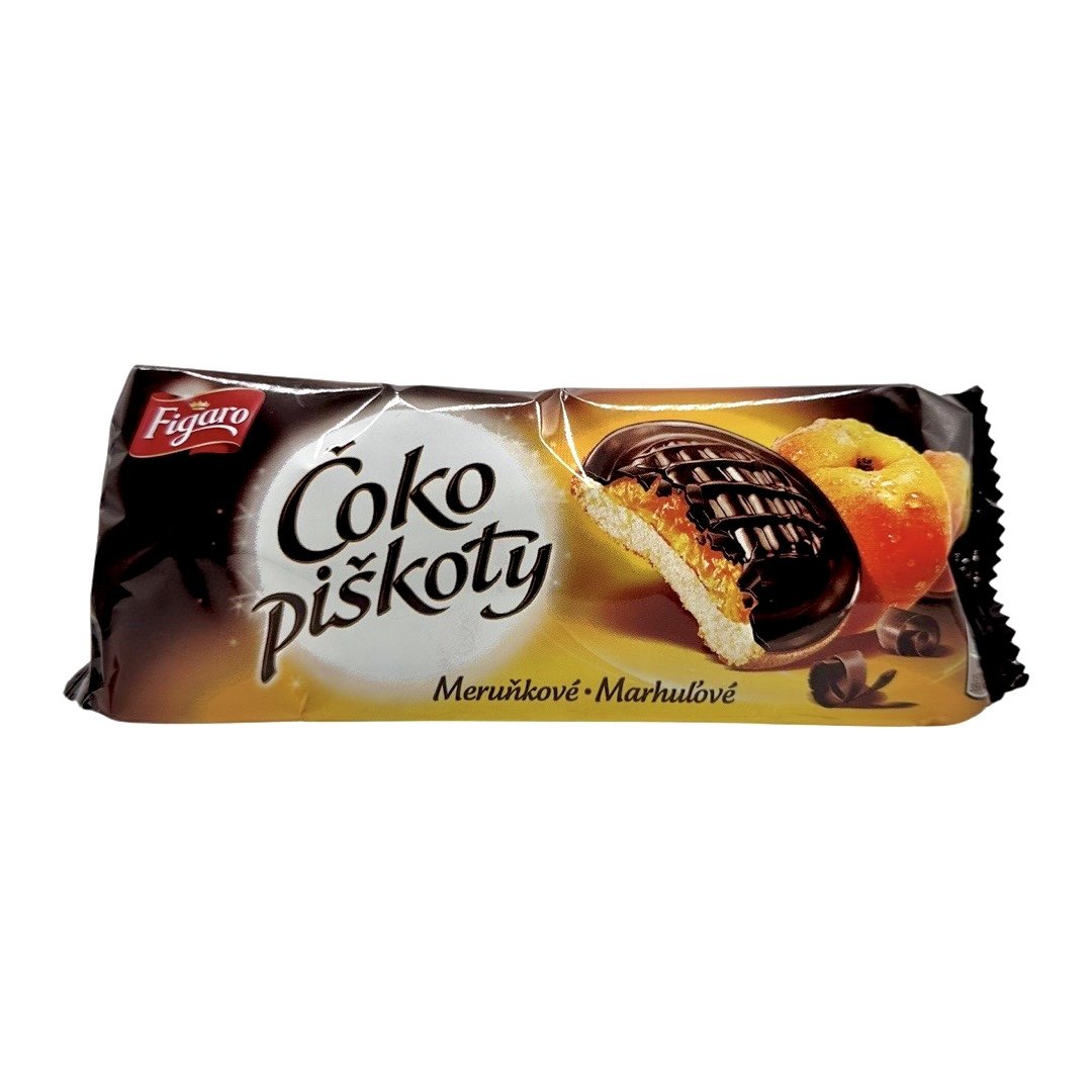 Jemné pečivo so želé (52 %) s marhuľovou príchuťou polomáčané v horkej čokoláde (15 %).