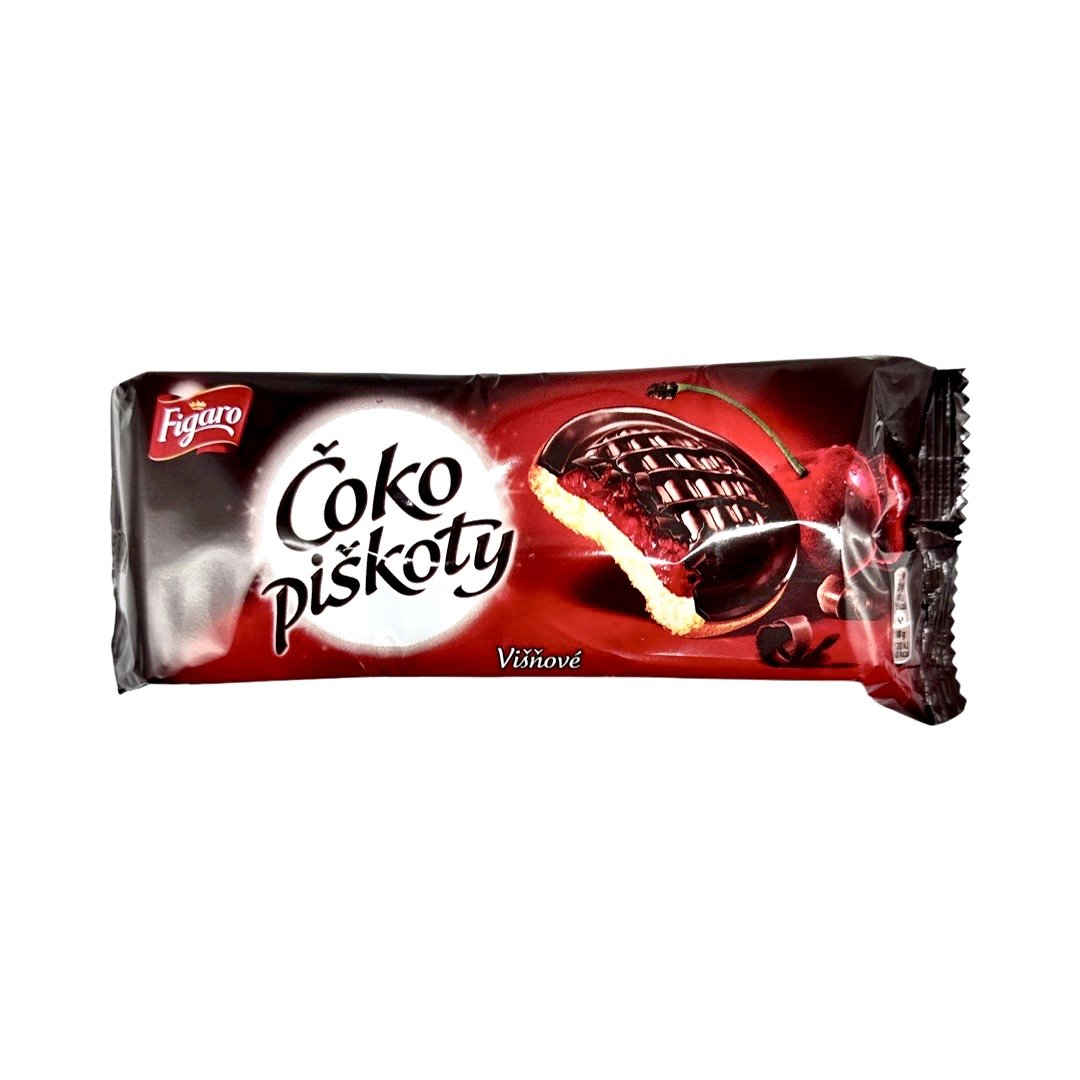 Jemné pečivo so želé (52 %) s višňovou príchuťou polomáčané v horkej čokoláde (15 %).
