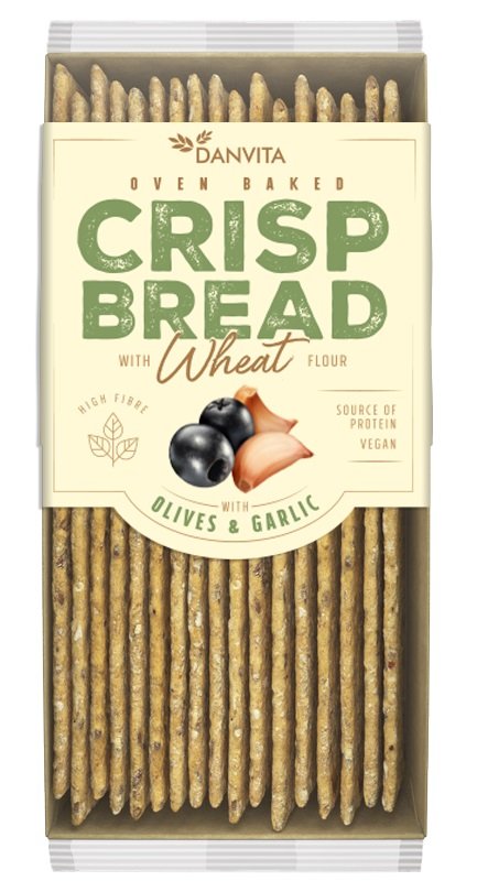 Danvita krekry sú remeselné pšeničné plátky s viditeľnými kúskami olív a cesnaku.