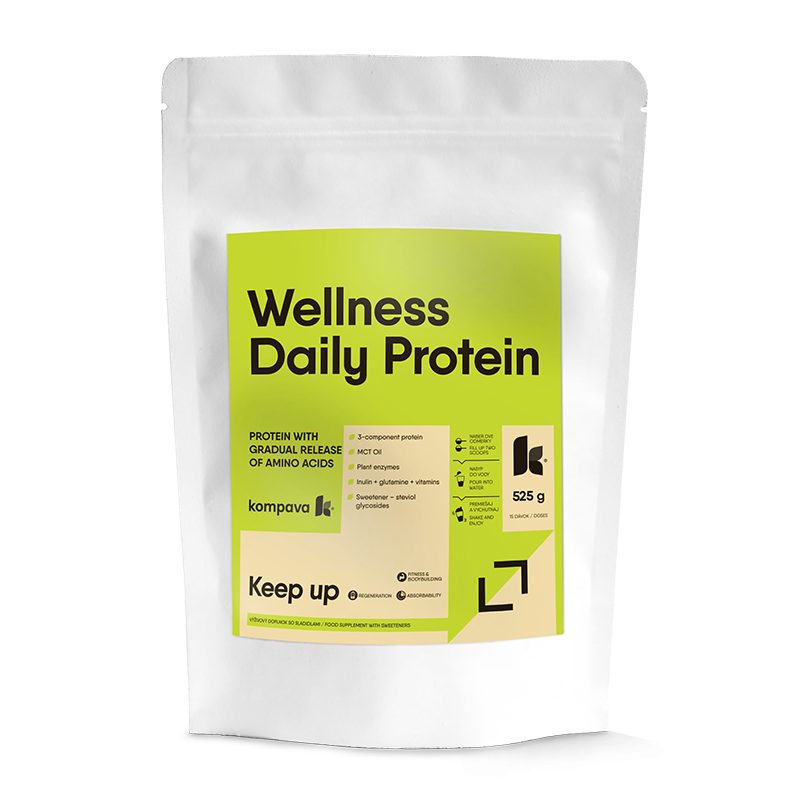 Wellness Daily Protein je unikátny proteín navrhnutý nielen pre športovcov, ale pre všetkých, ktorí dbajú o zdravý životný štýl a dlhodobú kontrolu hmotnosti. Tento produkt s jemnou vanilkovou príchuťou kombinuje srvátkový koncentrát, vaječný bielok a mliečny koncentrát, čím zabezpečuje postupné uvoľňovanie aminokyselín. Je obohatený o vlákninu, zdravé tuky (MCT), chróm pre stabilizáciu hladiny cukru v krvi a tráviace enzýmy, čo z neho robí ideálnu náhradu ľahkého jedla kedykoľvek počas dňa.
